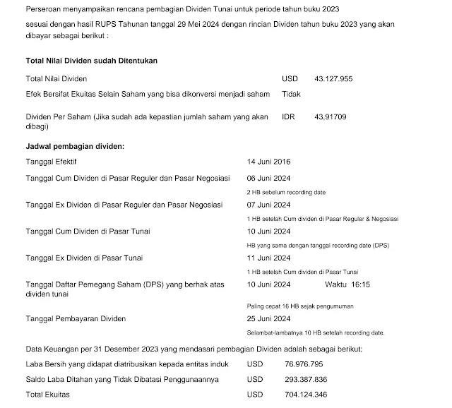 Pembagian dividen kepada pemegang saham POWR, total sebesar US 73,13 juta. Perlu diketahui bahwa PWOR telah membagikan dividen interim sebesar USD 30 juta pada 22 Desember 2023 lalu, dan sisanya USD 43,13 juta dibagikan sebagai dividen final, seperti yang telah disebutkan sebelumnya.